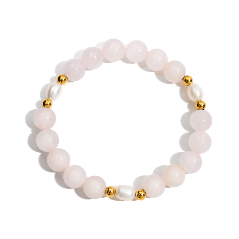 Elegant bracelet combining soft pink crystals, luminous freshwater pearls, and polished steel beads for timeless charm.
