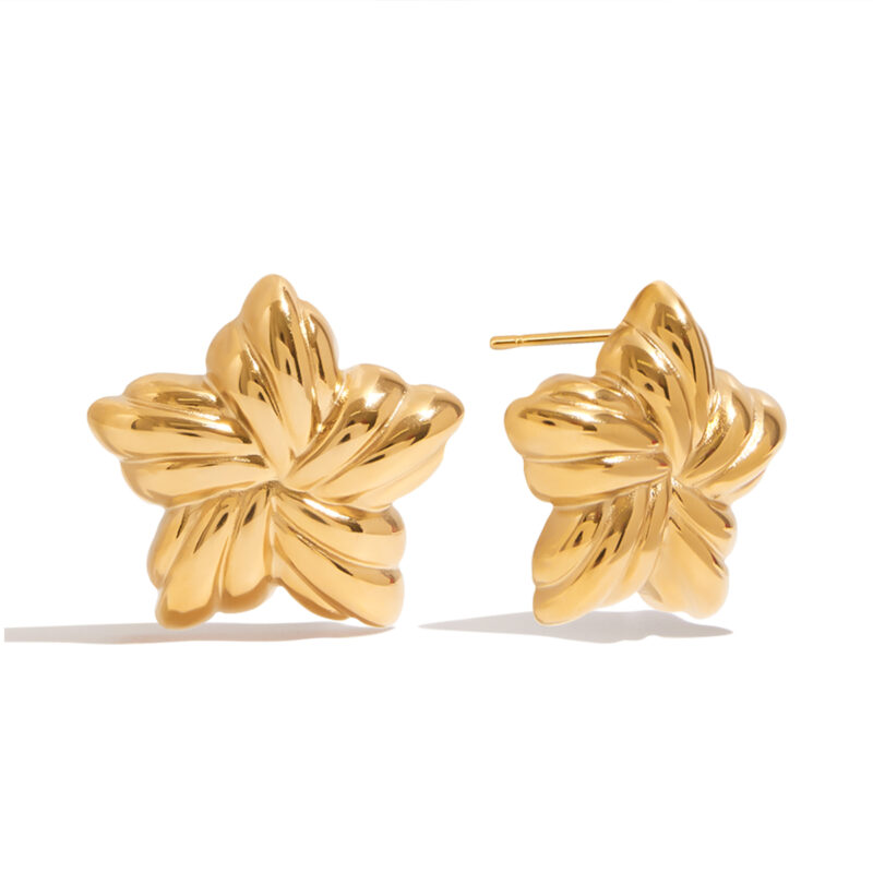 J&D New Trendy 18k Gold Stainless Steel Tarnish Free Gold Two Tone Ribbed Star Chunky Earrings